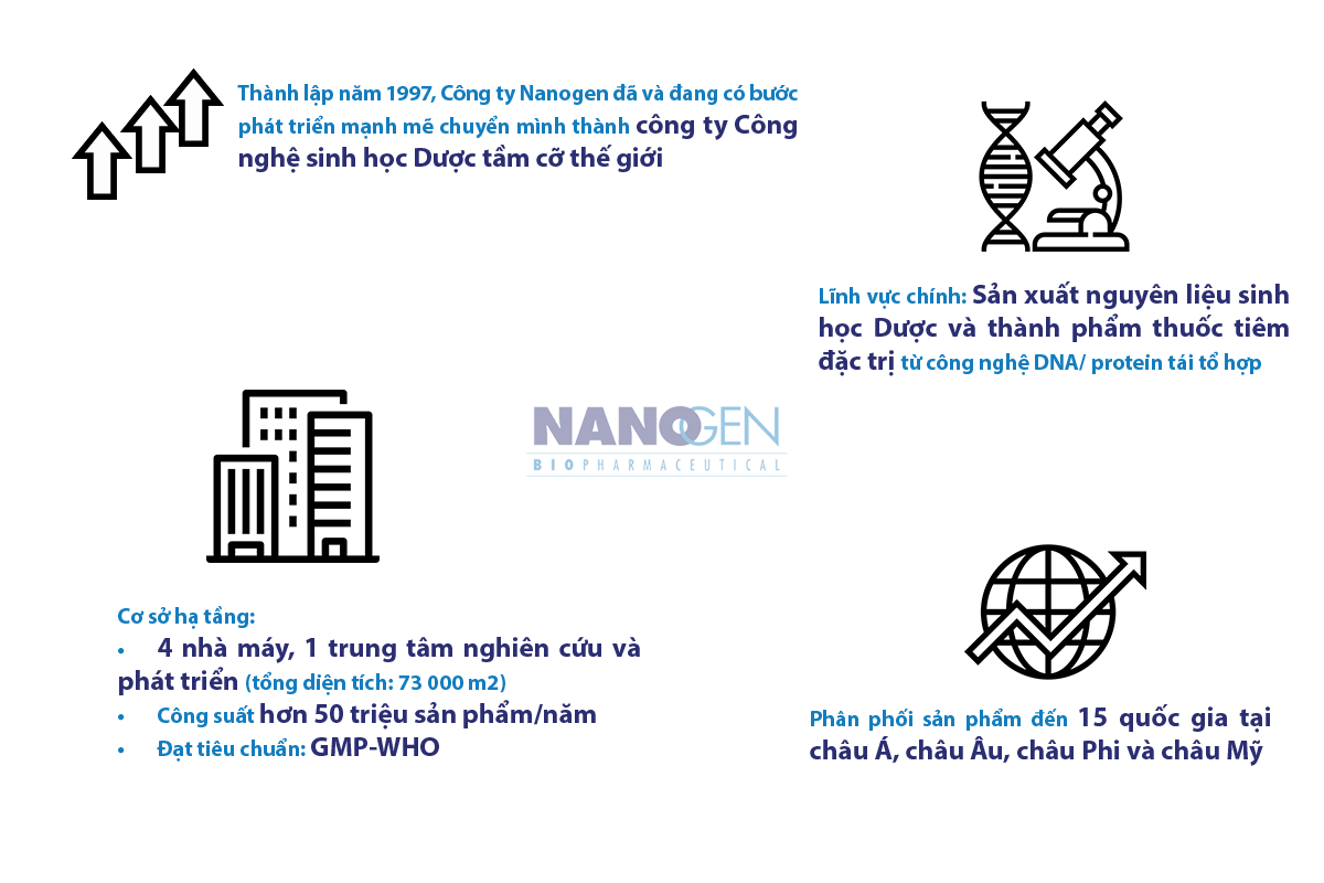 Thành lập năm 1997, CÔNG TY CỔ PHẦN CÔNG NGHỆ SINH HỌC DƯỢC NANOGEN đã và đang có bước phát triển mạnh mẽ chuyển mình thành một công ty Công nghệ sinh học Dược tầm cỡ thế giới. Chúng tôi tự hào là nhà nghiên cứu, phát triển và ứng dụng thành công các tiến bộ của ngành công nghệ sinh học hàng đầu trong khu vực Châu Á Thái Bình Dương trong việc sản xuất nguyên liệu Dược và thành phẩm thuốc tiêm đặc trị từ công nghệ DNA/ protein tái tổ hợp.