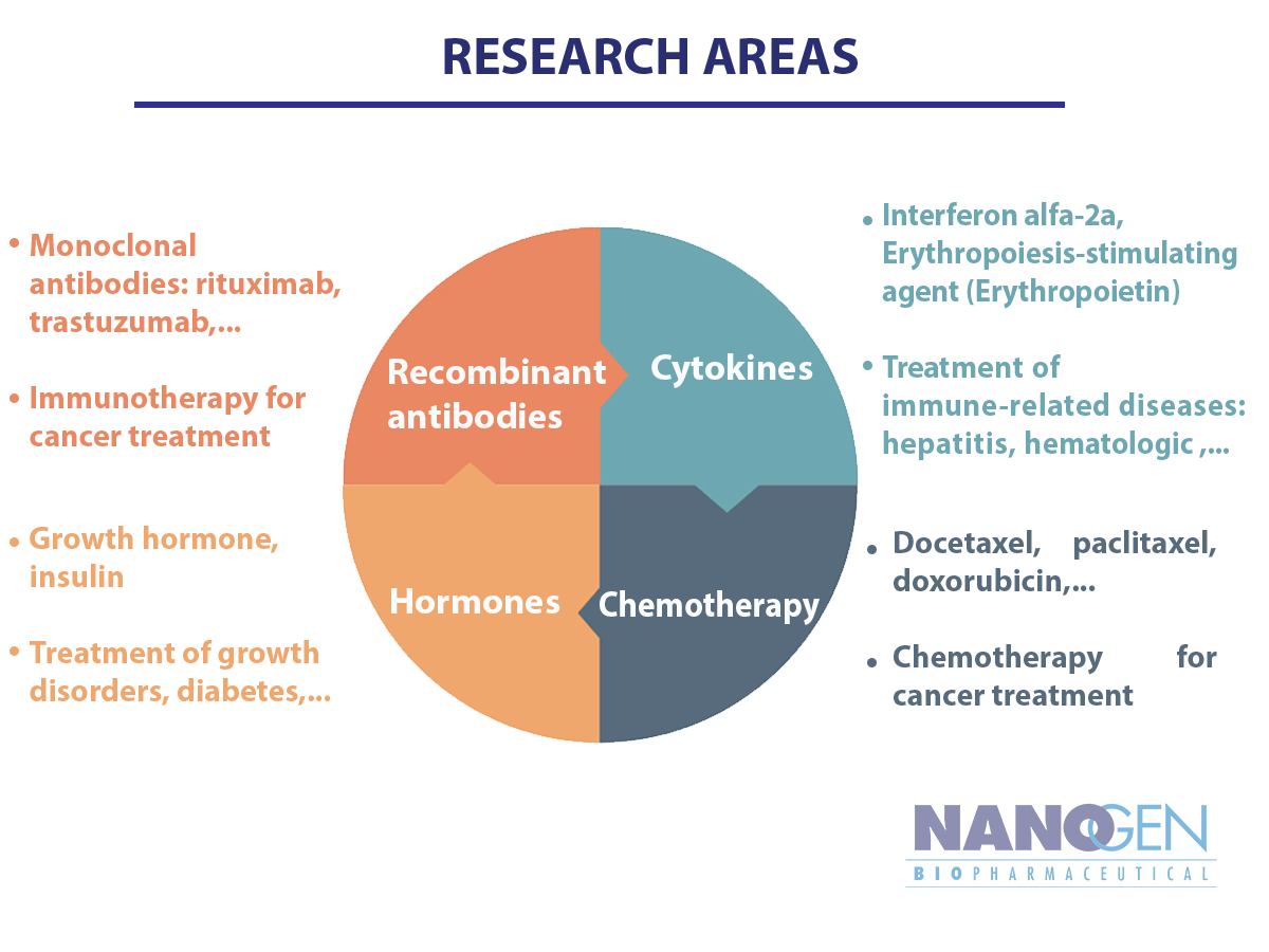 Nanogen’s platform technology is applying novel breakthroughs in genetic technology and fermentation technology to produce recombinant protein. Our drug discovery focuses on 4 major categories: Recombinant antibodies, Cytokines, Hormones and Chemotherapy.